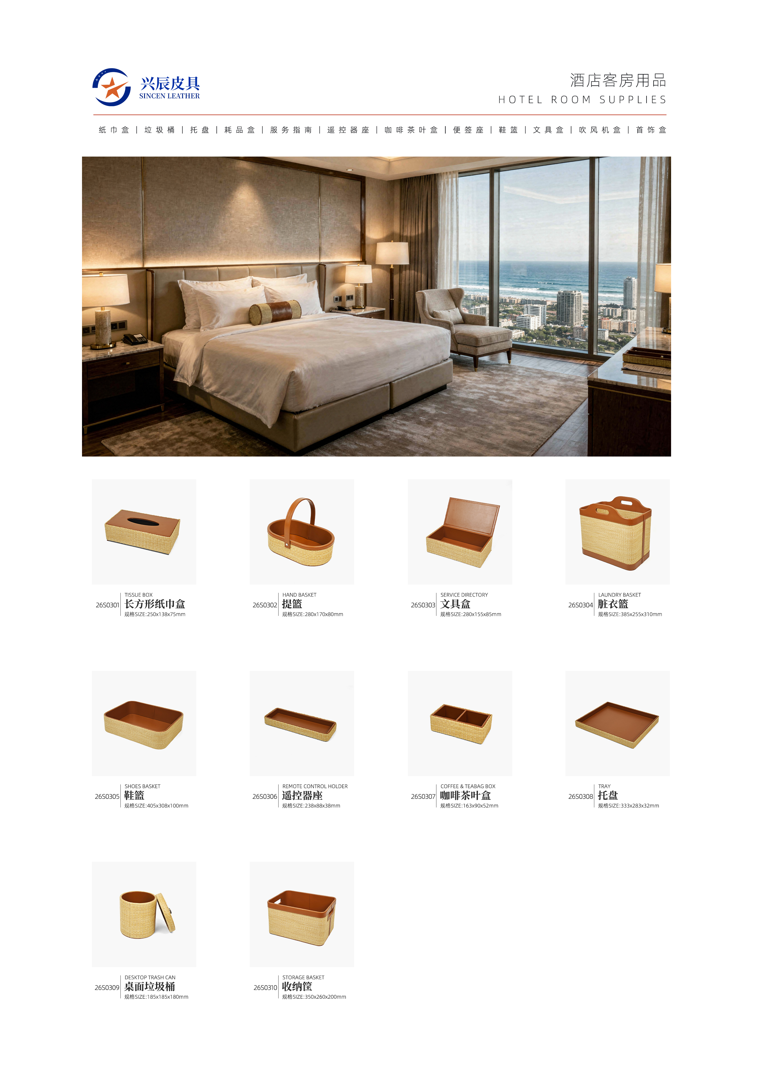 This hotel guest room amenities set features stylish PU leather with delicate straw weave texture, bringing a natural, warm and upscale feeling to modern guest rooms. The unique woven design adds texture and layering, while the durable construction ensures long-lasting use. Ideal for high-end hotels, resorts and boutique accommodations, it perfectly balances aesthetics and practicality, elevating the overall lodging experience for every guest.